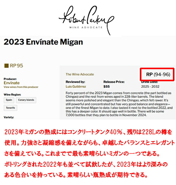 『2023年ミガンのは、力強さと凝縮感を備えながらも、卓越したバランスとエレガントさを備えている。これまでで最も素晴らしいミガンの一つである。ボトリングされた2022年も並べて試飲したが、2023年はより深みのある色合いを持っている。素晴らしい瓶熟成が期待できる。』