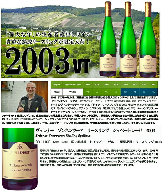 【完熟した贅沢なワイン。モーゼルでは最高。恐るべし品質のリースリングだ!!!!!】 と激賞コメントが残された、偉大なる歴史的超大当たり2003年ヴィンテージ!!!