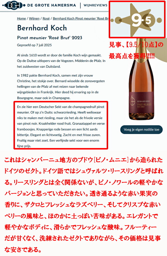 オランダ最高評価誌[De Grote Hamersma]で、時価一万円もの[ボランジェ]に勝利して、ほぼ満点となる[9.5/10点]を獲得!!!