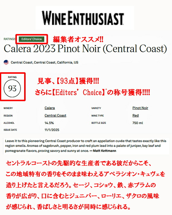 世界最高の評論家ロバート・パーカーが【カリフォルニアのロマネコンティ】と呼んだ伝説のワイン【カレラCALERA】!!!!