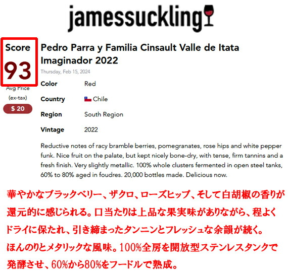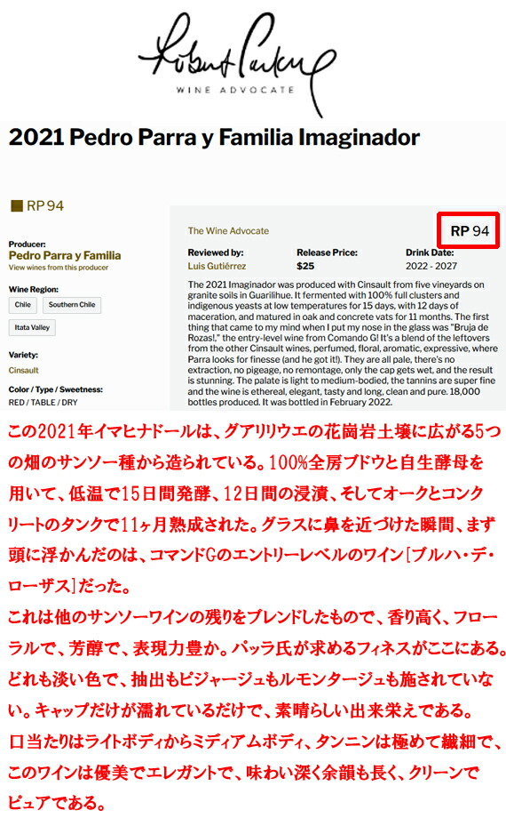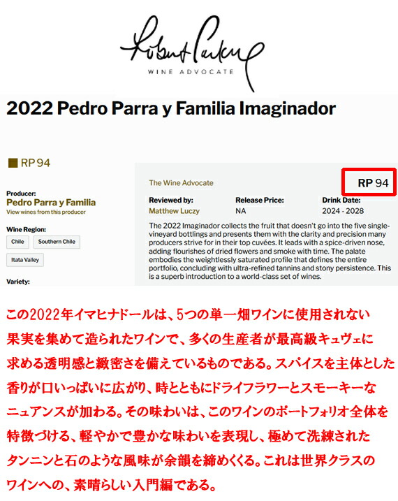 『このイマヒナドールは、多くの生産者が最高級キュヴェに求める透明感と緻密さを備えているものである。スパイスを主体とした香りが口いっぱいに広がり、時とともにドライフラワーとスモーキーなニュアンスが加わる。これは世界クラスのワインへの、素晴らしい入門編である。』
