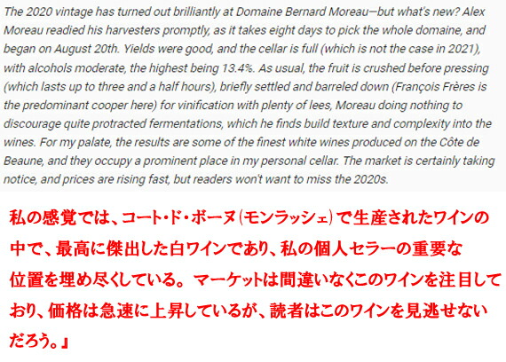 『モンラッシェで最高に傑出した白ワインであり、私の個人セラーの重要な位置を埋め尽くしている。』