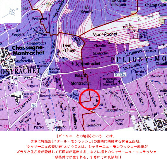 特級畑[バタール・モンラッシェ]の東隣の隣接する村名区画畑が2/3と、極上のシャサーニュ・モンラッシェ一級格付けがズラリと並ぶ真隣村名畑が1/3という、超豪華ブレンドから生まれる夢のようなブレンドから出来る大傑作!!