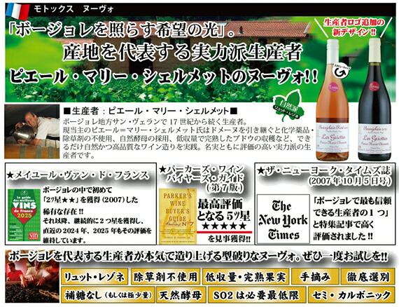 これぞボジョレーNo.1格付けに君臨する、 【本物の帝王ボジョレー!!!!!】 が、今年2025年もやって来るんです!!。 限定60本のみのご紹介となりますので、 ボジョレー最高頂点の味わいを堪能してみたい!!、 という方は、誰よりもお早めに、しっかりと入手してく ださい!!。 ここ日本では、かの[ジョルジュ・デュブッフ]が帝王と してその名前が知られていますが、 現地フランス人のワイン愛飲家に、最も偉大なるボジョ レーは?と質問すれば、大半の方が、『ヴィスー!!!!!!』 と答えるでしょう!!。 実にフランス最高評価誌[クラスマン]では、ボジョレー 地区でわずか3つの造り手にしか与えられていない二つ星 の栄冠を、2007年にこのドメーヌが誰よりも早く獲得!!。 このボジョレーに最高三つ星のドメーヌはないのですが、 二つ星といえば、今や時価数万円のブルゴーニュ最高峰 [コント・ラフォン]、[メオ・カミュゼ]、[デュジャック]、 そして[ルソー]、[ミッシェル・グロ]など、超有名凄腕と 全くの同格という物凄い栄冠!!。(ジョルジュ・デュブッフ は一つ星です) ボジョレー村は、ブルゴーニュ最高峰に追いつけない・・ という下馬評を覆す、異例の二つ星獲得にフランス中が、 そしてボジョレー村全体が大騒然となり、以来、この ボジョレーNo.1格付けに君臨する、名実ともに 【本物の帝王ボジョレー!!!!!】 なんです!!。2007年にこの栄冠を受賞した時のコメント には、こう書かれています。 『もはや並ぶべきワインは存在しない。深味、味わいの 骨格、何においても全てのボージョレを遥かに超えてい る!!』 こんな物凄いボジョレー・ヌーヴォーが、今年2025年も ここ日本で堪能することができるんです!!。 しかも、今年2025年ヴィンテージは、 夏の気候が、暑すぎず涼しすぎず、 乾燥した天候が続き、これにより、 ブドウは小粒ながらも完熟したブドウが 収穫されたため、例年以上の素晴らしい 出来となった、まさに歴史的超大当たり ヴィンテージなんです!!。 是非とも、この超凄腕が造る感動の味わいを、 決してお見逃しなく、今年もたっぷりとご堪能いただけ ればと思います!!!!。 その名も [ピエール・マリー・シェルメット・ボジョレー・プリムール・レ・グリオット2025]!!!!!!! 現当主のピエール・マリー・シャルメットさんは完全な る自然派農法によってワインを造る凄腕で、その徹底ぶ りは、 完全無農薬で化学肥料も一切使用しないで栽培したブド ウだけを使用し、 発酵はブドウの果皮についた野生酵母が自然に発酵する のを待ち、 瓶詰め酸化防止剤の添加を必要最低限に抑える・・・ といった、まさに一貫したの自然派農法を見事に実践!!。 まさに完熟トロトロのエキスを含んだ無農薬ブドウ100% を自然のまま発酵して、自然のまま瓶詰めした・・・ 超自然ボジョレー・ヌーヴォーというわけです!!。 しかも使用しているブドウは、ドメーヌがあるボジョレ ーの南端レ・グリオットの区画から採れた平均樹齢35年 の極めて濃縮するまで完熟した濃厚ブドウだけを、高級 ブルゴーニュさながらの選果台で三度にわたる厳選で、 さらに選び抜いて、このワインを造っているんです!!。 さすが異例の二つ星獲得の凄腕はやることが全く違いま す!!。しかもこの物凄い評価は、最高評価誌[クラスマン] にとどまらず、 [ゴーミヨ]2010年版では、見事[最も心に残るワイン賞] を獲得!!。さらには、[ベターヌ&デソーヴ]誌でも最高3つ星 評価を獲得!!。 このフランス三大誌で、すべて最高評価を獲得する、 まさに不動のボジョレーNo.1格付けです!!。 そしてそして!!、今回登場の[レ・グリオット]は、 最高評価誌[クラスマン]で2008年ヴィンテージが14/20点 を獲得した、本格ボジョレーとしてリリースするワイン を特別にヌーヴォーで先に堪能できる、まさに【本物の 帝王ボジョレー】なんです!!。(14/20点といえば、ジョ ルジュ・デュブッフ特級モノと同点です!!)。 通常、ボジョレー・ヌーヴォー用に造る造り手が多い中、 これぞ本物の新酒です!!。これぞボジョレーNo.1格付け に君臨する【本物の帝王ボジョレー!!!!!】。 限定120本のみ!!、是非とも、是非とも、是非とも、お見 逃しなくお買い求めください!!。