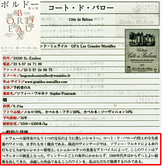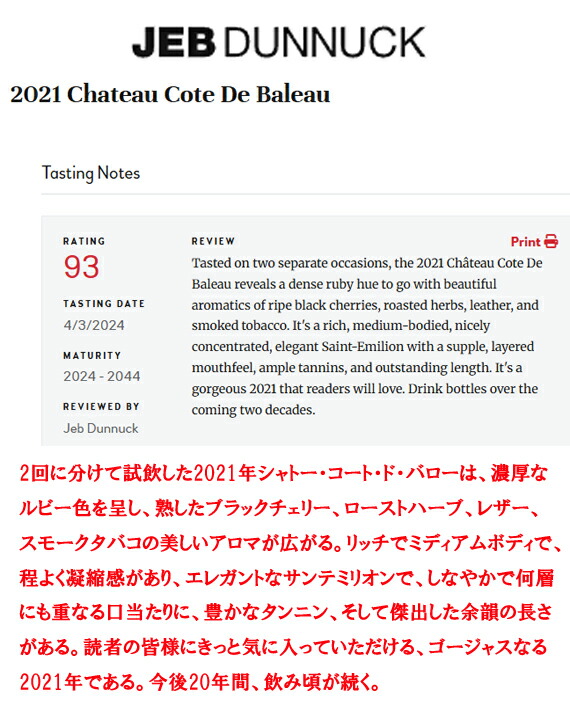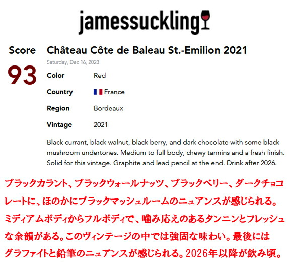 『濃厚なルビー色を呈し、熟したブラックチェリー、ローストハーブ、レザー、スモーク・タバコの美しいアロマが広がる。リッチでミディアムボディで、程よく凝縮感があり、エレガントなサンテミリオンで、しなやかで何層にも重なる口当たりに、豊かなタンニン、そして傑出した余韻の長さがある。』