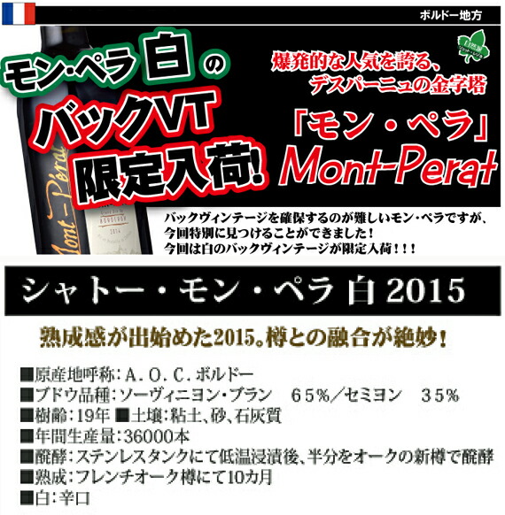 しかもバーカー過去最高評価獲得の2015年ヴィンテージを、【モン・ペラ】を造りしデスパーニュ家が、密かに自らのシャトーのセラーに保管し、そして、10年間の熟成を経て、今年、遂にリリースしてきた、とてつもない秘蔵の【白いモン・ペラ】!!!!