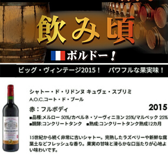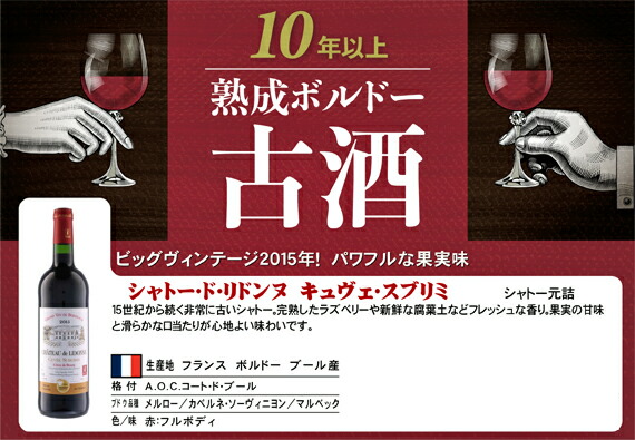 フランス最高評価誌で【満点三ツ星★★★最高峰】を獲得した超濃厚ボルドー、偉大なる【11年熟成】2015年ヴィンテージが二度とない大特価1680円!!!!