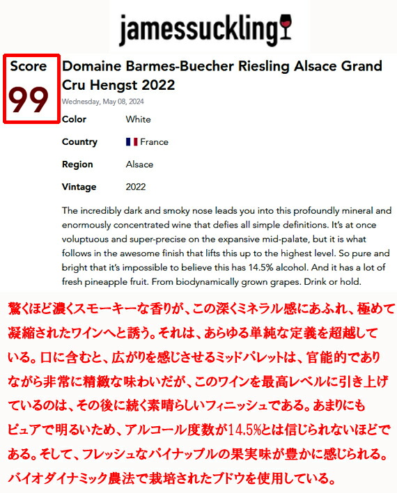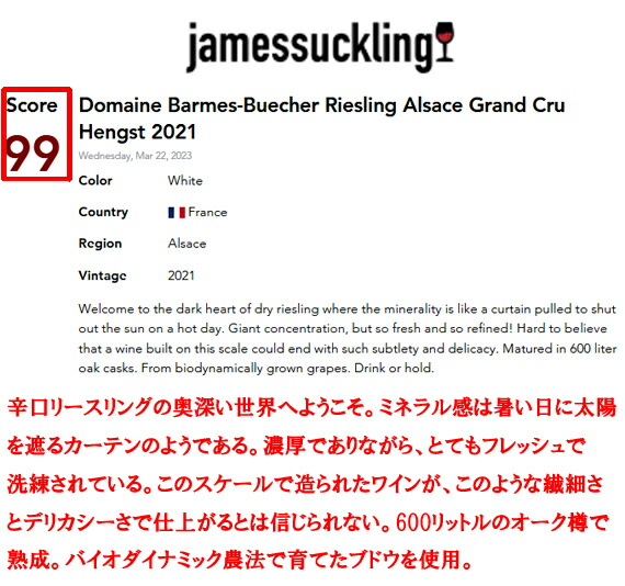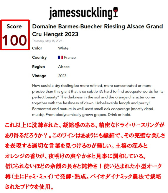 新進気鋭の評論家ジェームス・サックリングが見事【100点満点】をつけた、これ以上ない[世界最高のリースリング100%ワイン]!!!!!