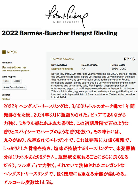 [ドメーヌ・バルメス・ブシェール・リースリング・グランクリュ・ヘングスト 2022]