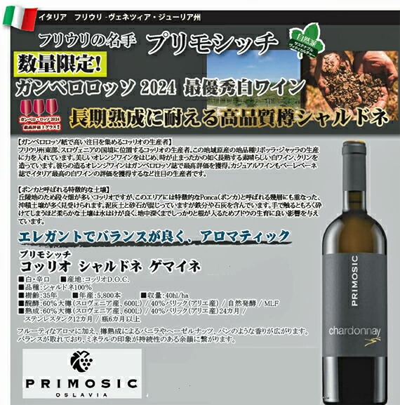 イタリア白ワインの銘醸地フリウリ州の超凄腕[プリモシッチ]が、極上のシャルドネ100%で造る白ワイン!!