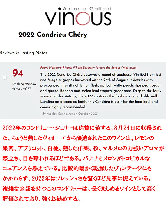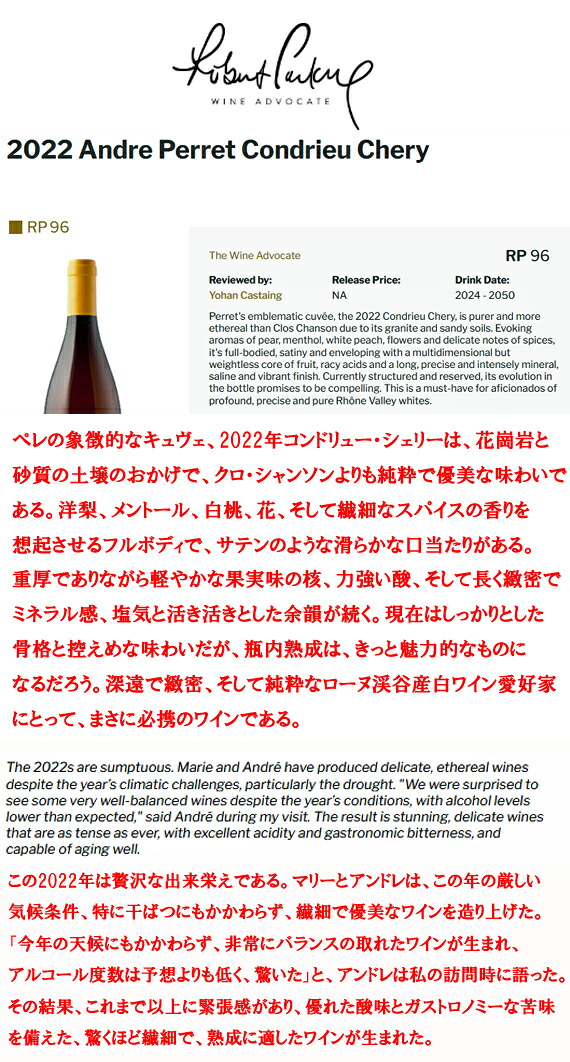 『白桃、蜂蜜のような花、素晴らしいミネラル感、そしてほのかなバラの花びらの香りと風味が感じられる。ミディアムボディからフルボディで、塩味とミネラル感に溢れ、信じられないほどピュアなコンドリューは、今飲んでも魔法のような味わいだが、10年経っても十分に熟成が進むだろう。』