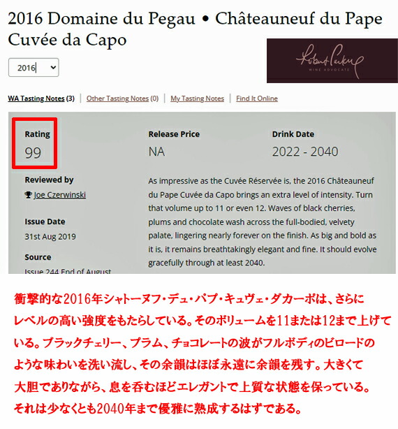 2016   Domaine du Pegau Chateauneuf du Pape Cuvee da Capo  99点