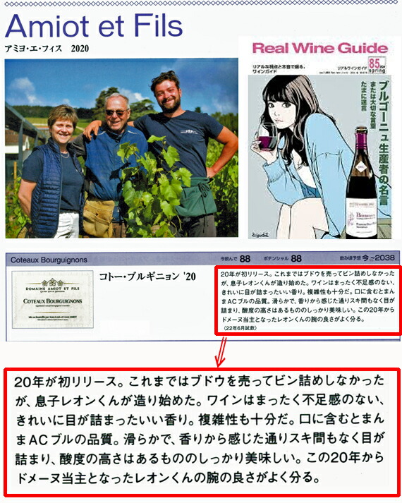 『柔らかさと強さを併せ持った黒赤果実のいい香り。香りがとても滑らかだ。口の含むと、ちょっとビックリ。味は正にピノ・ノワールとガメイの風味で、愛らしくて、しとやかで美味しいし、何より滑らかでこのクラスからして上質感がある。そんじょそこらのACブルゴーニュを蹴散らす品質の、魅力あふれるコート・ブルギニョン。』