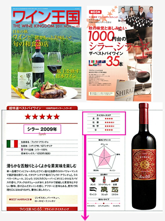 史上最高の激安ワインだ!! わずか1590円の超お買い得ワインに、あの世界一のソム リエ・田崎さんが、なんとなんと[17/20点]という、 物凄い点数をつけたんです!!!!!。 遂に!!、遂に!!、皆さんにこのワインをご紹介できる日 がやって参りましたぁーーー!!!!!!。 昨年秋に、初めて日本に輸入されたワインなんですが、 なんといきなり世界一のソムリエ・田崎真也さんが、 [ヴィノテーク2009年12月号]で、わずか1590円の、まさ にこのワインに対して、【[17/20点]】という、5000円 以上のワインでも、なかなか獲得できない、そんな高得 点を記録して、輸入されるや否や瞬く間に完売に!!。 以来、当店にも入手できない日々がずーっと続いていた んですが、それが、いよいよ!!、いよいよ!!、皆さんに ご紹介できる日がやってきたんです!!。 わずか1590円という価格にして、田崎真也さんは、こう コメントしています!!。 『紫がかった濃いガーネット色。香りは濃縮感を含み、 品種の個性が感じられる。ブラックベリーのコンポート やすみれの花に、ヴァニラ、ココナッツ、ほのかなスパ イスやビターチョコなどのニュアンス。まろやかで膨ら みのある果実味が広がり、全体にバランスがよくなめら か。確かに高いコストパフォーマンスも評価したい。 (ヴィノテーク 2009年12月号)』 【確かに高いコストパフォーマンスも評価したい!!】 1590円以上の見事な味わいてあることを断言しているん です!!。 そしてそして!!、 このワインは、今大流行している東京のビストロ系フレ ンチでは、【超大人気】状態で、数々の有名人気ビスト ロが挙ってこのワインを採用しているため、輸入される や瞬く間に完売になることが、ここ一年ずーっと続いて いるんです!!。 なので、皆さん!!、 本日、絶対に見逃してはいけません!!。 そして、あの世界一のソムリエ・田崎さんが、 さらには、数々の有名人気ビストロが絶賛する、この見 事な高コストパフォーマンスなる味わいを、たっぷりと たっぷりとご堪能いただければと思います!!。 その名も [フェウド・アランチョ・シラー]!!!!!!!!!! イタリアは、あの[ゴッド・ファーザー][ニュー・シネマ パラダイス]などの映画の舞台シチリア島は、西部アグリ ジェント県シャッカ近郊のサンブーカ・ディ・シチリアと、 さらに南のラグーサ県のアカーテに、実に計950haもの畑 を所有し、 まさに、 「最高のコストパフォーマンス」 「料理と相性のよいワイン」 をテーマに、ヴァラエタル(単一ブドウ100%)ワイン造り を展開する、まさに超お買い得ワインの宝庫たる凄腕[フ ェウド・アランチョ]の、シラー100%で造られるワイン です!!。 ここには2人のワイン醸造家と7人のアシスタントで構成 された醸造チームが、 【リッチでエレガント、情熱的なアロマとソフトなタン ニンを持った高品質なワインを生み出すこと!!】 という使命とともにワイン造りに取り組み、その世界的 評価が半端なく物凄いんです!!。数々の国際コンクール で数々の賞を受賞しているんですが、このシラーだけに 限っても、直近わずか3年で ・Berliner Wine Trophy 2010 銀賞 ・San Francisco International Wine Competitors 銀賞 ・Mundus Vini 2009 銀賞 ・AWC Vienna 2009 銀賞 ・Wine Spectator 88点 ・guida I Vini di Veronelli 2009 88点二つ星★★ ・Premium Select Wine Challenge at ProWein 2009 銀賞 ・Wine access - may 2008 88点 ・Guida I Vini di Veronelli 2008 87点 ・Annuario di Luca Maroni 2008 87点 特にイタリア最高評価誌のひとつ[ヴェロネッリ2010]で、 準満点の二つ星★★がズラリと並ぶ、その姿は壮観です!!。 まぁ是非とも飲んでみください!!。 『紫がかった濃いガーネット色。香りは濃縮感を含み、 品種の個性が感じられる。ブラックベリーのコンポート やすみれの花に、ヴァニラ、ココナッツ、ほのかなスパ イスやビターチョコなどのニュアンス。まろやかで膨ら みのある果実味が広がり、全体にバランスがよくなめら か。』 と田崎さんは、コメントし、このワインを輸入するイン ポーターさんは、 『プラムやカシスのような果実のアロマに粒胡椒のスパ イス感。タイムのようなハーブ香も感じられる。滑らか な舌触りに、ふくよかな果実味。酸味が全体の味を引き 締める。 』 その滑らかで、まろやかで、濃厚で香ばしい果実味は、 料理との相性が抜群で、肉料理ならば、ステーキでも煮 込みでも、どちらでも、たっぷりまろやかな味わいが最 高のマリアージュを運んでくれると思います!!。 遂に、遂に、皆さんにこのワインをご紹介できる日がや ってきました!!!!!!。 私は未だかつて、田崎さんが、わずか1590円のワインに 17/20点をつけたのを見たことがありません!!。 なので、これぞ史上最高の激安・お買い得ワインです!! 瞬く間に完売となる前に、たっぷりと買い占めておいて ください!!。