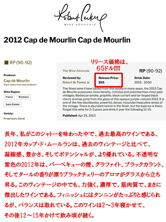 『不透明な紫色の2012年は、バーベキューの煙、グラファイト、ブラックカラント、そしてタールの香りが漂うブラックチェリーのアロマがグラスから立ち昇る。力強く、濃厚で、筋肉質で、まさに傑出したワインである。』