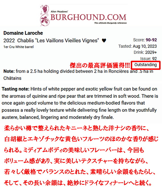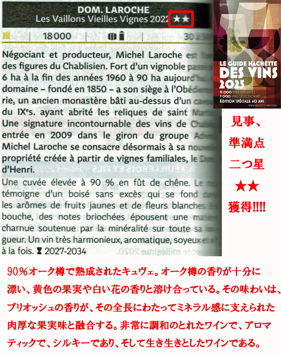 1850年創業にしてシャブリの名声を築いてきた歴史的建造物を誇る、シャブリの巨匠[ラロッシュ Laroche]が樹齢65年もの豪華シャルドネで造る一級畑[ヴァイヨンVaillons]!!!!
