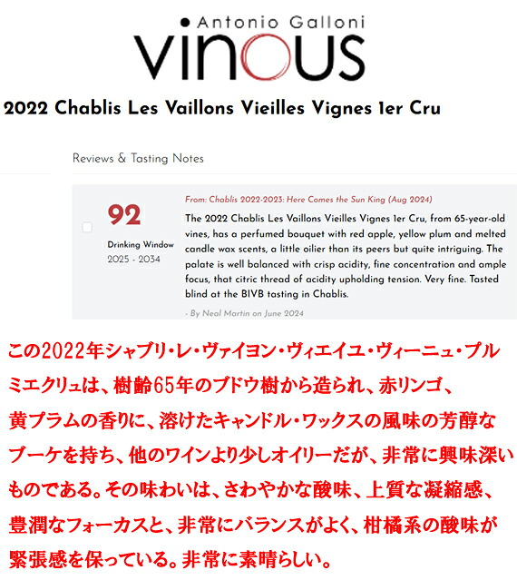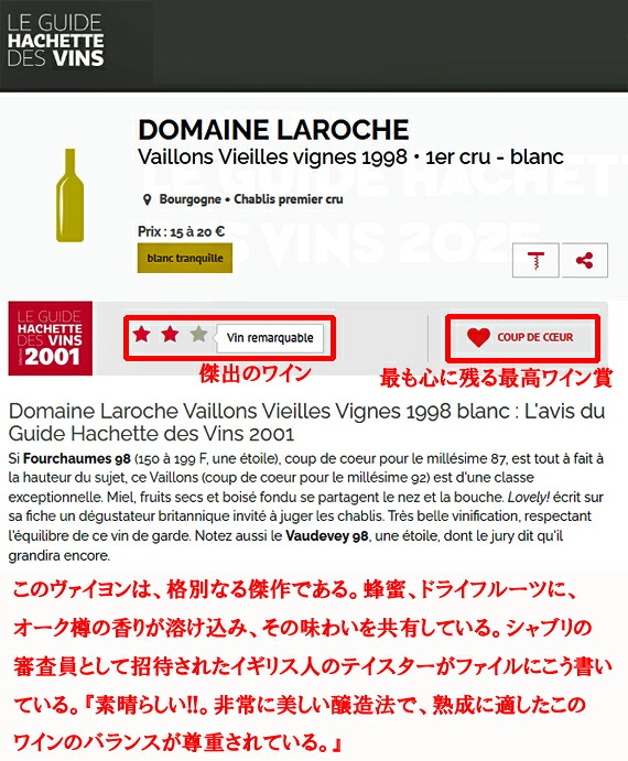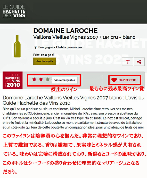 『このヴァイヨンは陪審員の心を掴んだ。非常に理想的なワインであり、上質で繊細である。香りは繊細で、果実味とミネラル感が共有されている。味わいは完璧に構成されており、新鮮さとヨードの風味があり、このボトルはシーフードの盛り合わせに理想的なマリアージュとなるだろう。』