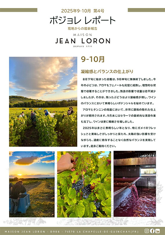 ◆当店初入荷!!◆ 国内最高峰のボジョレー・ヌーヴォーが ついに登場!! なんと!!、300年以上の歴史を誇るボジョレー 最古の名門メゾンが手がけた、最高峰のボジョレー・ ヌーヴォーを入手しました!! しかもこのヌーヴォーは、 フランスの公式コンクール、 「Trophe Beaujolais Nouveaux 2023 (トロフェ・ボジョレー・ヌーヴォー)」 で堂々【◆金賞受賞◆】!! まさに、ボジョレー・ヌーヴォーの頂点に 君臨する一本なんです!! 使用されるブドウは、自社畑を含む平均樹齢 50年以上の古樹!! 収穫後は無濾過製法で仕上げ、 亜硫酸を極力控えることで、ブドウ本来の 果実味とテロワールの個性を余すところなく 表現しています。 その味わいはフランス国内でも高く評価され、 高級カジノホテルや有名レストラングループ でも採用!! 多くのワイン愛好家に愛され続け ています!! 300年の伝統、自然への敬意、古樹の力、 テロワールの生命力…、それら全てが凝縮され た、まさに至福の味わい!! 是非とも感動と華やぎに満ちた、このボジョレー・ ヌーヴォーをお楽しみください!! その名も [メゾン・ジャン・ロロン・ ボジョレー・ヌーヴォー・トラディション 2025]!! これは是非とも飲んでみてください!! 1711年創業、300年以上の歴史を誇るボジョレー 最古の名門メゾン、[ジャン・ロロン]。 その伝統と卓越した技術が結集した、国内最高 峰のボジョレー・ヌーヴォーをご紹介します!! このヌーヴォーは、フランスの公式コンクール、 「Trophe Beaujolais Nouveaux 2023 (トロフェ・ボジョレー・ヌーヴォー)」 で、見事【◆金賞◆】を受賞した、 まさにボジョレー・ヌーヴォーの頂点に君臨する 一本なんです!! このワインを手掛けた[ジャン・ロロン]は、 ボジョレーとマコネの大地に深く根を張る、 伝統ある名門メゾン。代々受け継がれてきた 自社畑は、総面積なんと220ヘクタールにおよび、 ボジョレー地区の10クリュのうち8つを手がける、 まさにボジョレーを象徴する存在です。 現在はボジョレ地区に9つのワイナリーを構え、 栽培から醸造、瓶詰までを自社一貫管理。 ブドウの一粒一粒にまで細心の注意を払い、 常に最高品質のワインを生み出しています。 また自然への敬意から、ブドウ栽培は [リュット・レゾネ]を採用。これは農薬の使用 を必要最小限にとどめ、環境への配慮を重視し た持続可能な栽培法です。 さらにフランス政府認定の 『HVE認証(Haute Valeur Environnementale :レベル3)』も取得。この[HVEレベル3]とは、 フランス政府が定める、環境に優しい農業の 公式認証制度の中で『最上位ランク』にあたる もの。厳しい環境基準をクリアした、人にも 地球にも優しい栽培が行われている証です。 また[ジャン・ロロン]は、この地でいち早く 亜硫酸(SO)削減に取り組んだ先駆者なんです!! 2009年以降は、赤ワインの95%でSO無添加を 実現し“ナチュラル・スタイル”を確立しました。 使用するブドウは、自社畑を含む厳選された畑の 平均樹齢50年の古樹。収穫後は無濾過製法で仕上 げ、亜硫酸を極限まで抑えることで、ブドウが持 つ純粋な果実味とテロワールの個性をダイレクト に表現しています。 [ジャン・ロロン]が手がけるこのヌーヴォーは、 輝きのある紫色をしており、グラスからはフレッ シュなカシス、チェリー、ラズベリー、野イチゴ の香りが立ち昇ります。 口に含むとふくよかで芳醇、熟した果実の味わい が広がり、果実味・タンニン・酸味の絶妙なバラ ンスにより、程よい飲み心地が楽しめる、上質か つエネルギーに満ちた味わい。メゾンの風格を感 じさせる古樹から生まれた、特別なボジョレー・ ヌーヴォーです!! その品質はフランス国内でも高く評価され、 高級カジノホテル〈Barrire(バリエール)〉や 有名レストラングループ〈Bertrand Hospitality (バートランド・ホスピタリティ)〉でも採用さ れています。 このボジョレー・ヌーヴォーは、ただの新酒では ありません。300年の歴史を誇る名門メゾンが造り 上げたその味わいは、熟成赤ワインにも引けを取 らない深みと上質さを兼ね備えた、まさに格別な 味わいが体感できます!! 限定36本のご紹介です。 ボジョレーを代表する老舗メゾンが手がけた、 『最高峰ボジョレー・ヌーヴォー』の味わいを、 是非ともご堪能ください!!