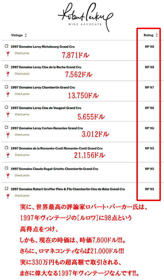 1997 Domaine Leroy Chambertin Grand Cru 97点 13,750ドル