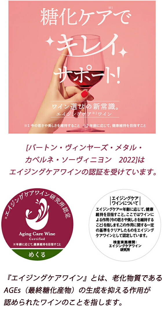 スミレの花、レッドベリー、バニラが溶け合う濃密なアロマ。滑らかなタンニンにブラックベリーの濃厚で奥行のある味わい!!この美味しさがまさかの1470円で楽しめるなら『毎日でも飲みたーい!!』しかもずっしりとした重厚感のあるボトルにメタル調のラベルは、まるでプレミアムワインの風格!! さらにこのワインは健康維持にも期待できる【エイジングケアワイン】に認定!! 高級感漂う『金賞二冠カベルネ!!』は“常備ワイン”リスト入り確定の一本!!