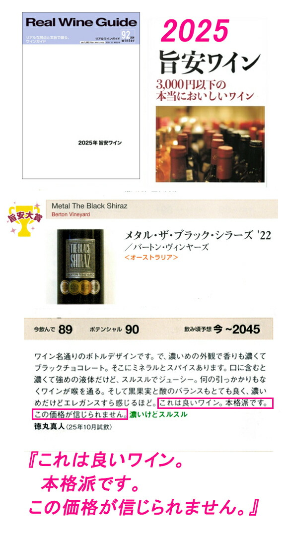 ブラックベリーやプラム、リコリス、ローストコーヒーが溶け合う濃密なアロマ。口いっぱいに広がる重厚な旨みとリッチな余韻は、まさに圧巻!!!!この味わいがまさかの1470円で楽しめるなら『毎日でも飲みたーい!!』しかもずっしりとした重厚感のあるボトルにメタル調のラベルは、まるでプレミアムワインの風格!! 高級感漂う『金賞三冠シラーズ!!』は“常備ワイン”リスト入り確定の一本!!